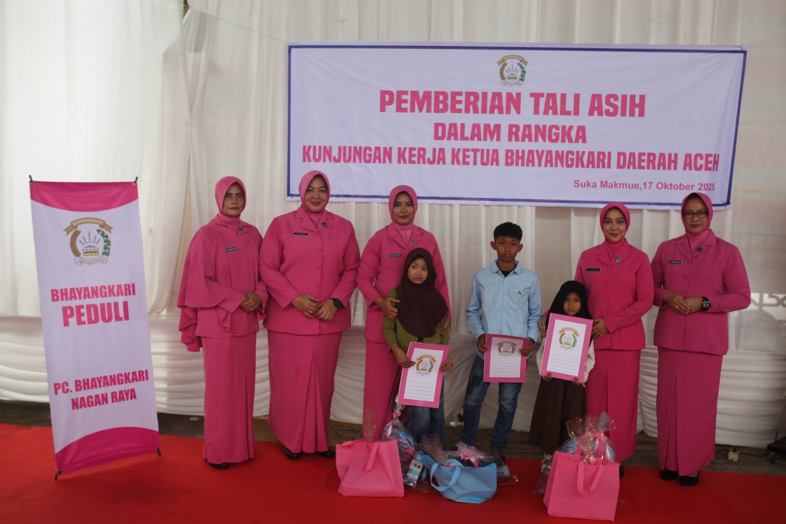 Selain memberikan santunan kepada anak yatim, Ketua Bhayangkari Daerah Aceh juga memberikan tali asih kepada keluarga personel Polres Nagan Raya yang sedang mengalami musibah atau sakit, sebagai wujud perhatian dan dukungan moril dari Bhayangkari Daerah Aceh.