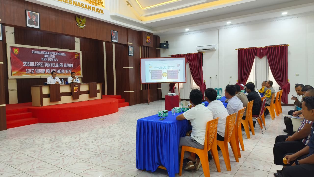 Nagan Raya — Polres Nagan Raya melalui Seksi Hukum (Sikum) menggelar kegiatan penyuluhan hukum pada Selasa, 18 November 2025 pukul 09.00 WIB bertempat di Aula Bharadaksa Polres Nagan Raya. Kegiatan ini diikuti oleh personel Bhabinkamtibmas, personel Sat Reskrim, serta para Kanit Reskrim Polsek jajaran.
