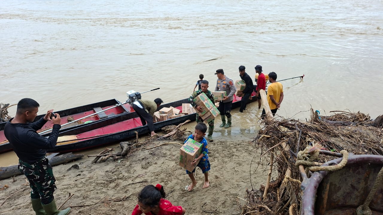 Proses distribusi dilakukan menggunakan sampan/boat milik masyarakat, mengingat akses darat belum dapat dilalui akibat rusaknya jembatan penghubung.