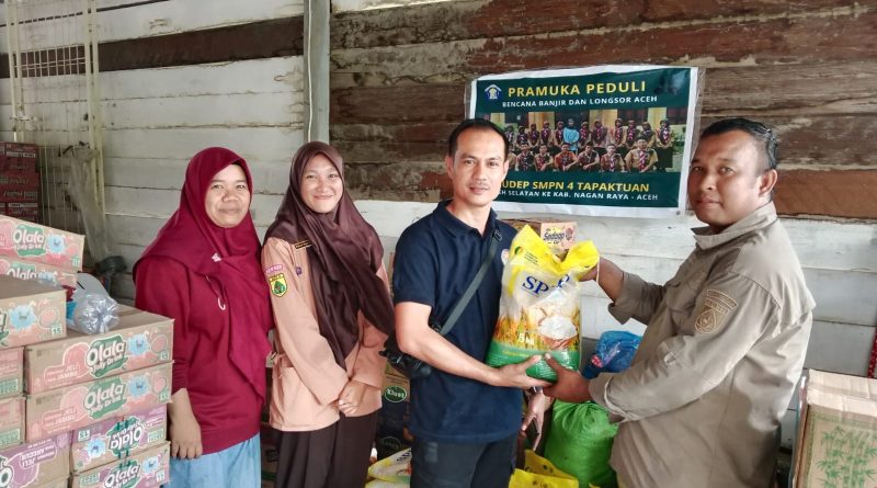 Nagan Raya – Kasi Humas Polres Nagan Raya IPDA Fardianto menerima titipan bantuan kemanusiaan dari Gugus Depan Pramuka SLTPN 4 Tapaktuan, Kabupaten Aceh Selatan, untuk korban bencana banjir bandang yang melanda Kecamatan Beutong Ateuh, Kabupaten Nagan Raya.