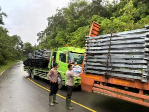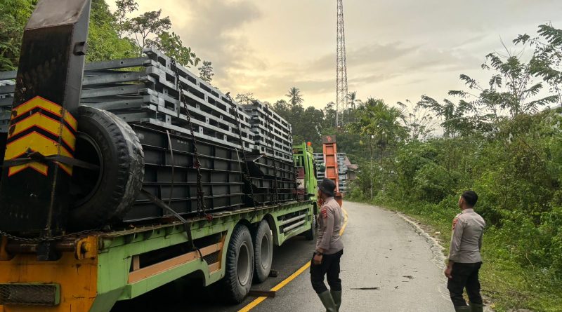 Nagan Raya – Personel Pos Bencana Polres Nagan Raya melaksanakan pengamanan kedatangan mobil trado pengangkut material jembatan Bailey di Kecamatan Beutong Ateuh, Jumat (19/12/2025) sore.