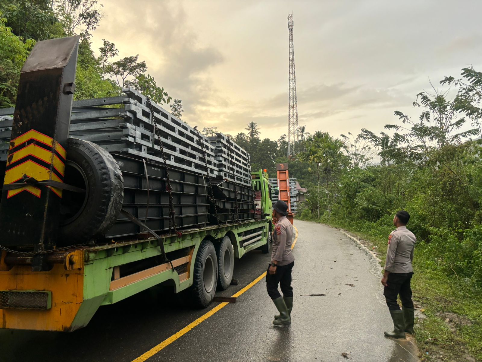 Personel Pos Bencana Polres Nagan Raya Amankan Kedatangan Material Jembatan Bailey di Beutong Ateuh