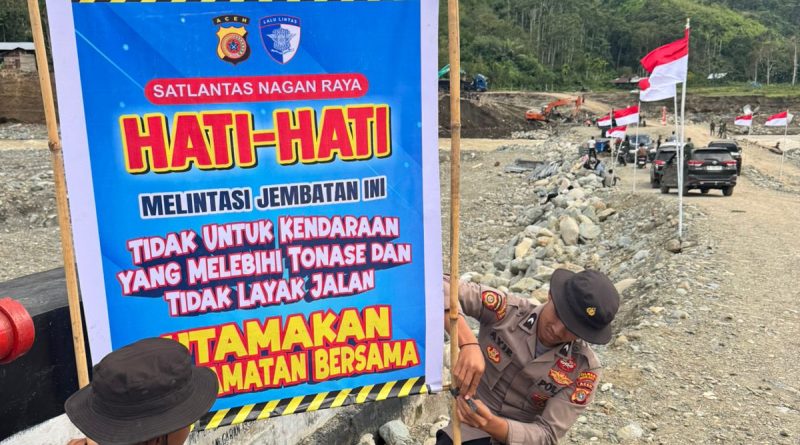 Nagan Raya – Dalam rangka mendukung pelaksanaan Operasi Lilin Seulawah 2025, Satuan Lalu Lintas (Satlantas) Polres Nagan Raya melaksanakan kegiatan pemasangan spanduk himbauan Keamanan, Keselamatan, Ketertiban dan Kelancaran Lalu Lintas (Kamseltibcarlantas) di area jembatan darurat, Senin (22/12/2025).