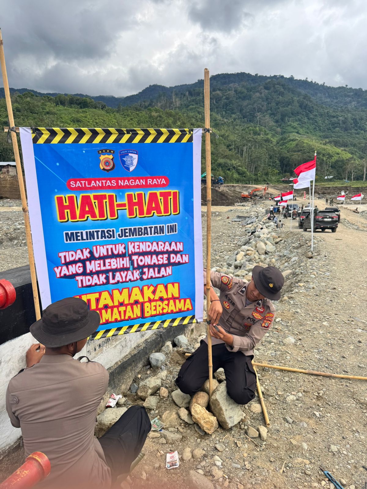 “Kami mengimbau kepada seluruh pengemudi, terutama kendaraan angkutan barang, agar tidak melintasi jembatan darurat dengan muatan berlebihan. Hal ini demi keselamatan pengemudi, pengguna jalan lainnya, serta untuk menjaga kondisi jembatan agar tetap dapat digunakan oleh masyarakat,” ujar Iptu M. Arie Syahputra, S.A.P.