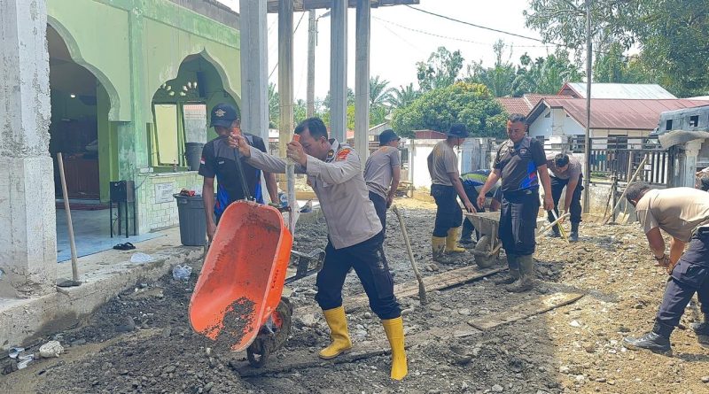 Polres Nagan Raya Laksanakan Gotong Royong Pemulihan Masjid Pasca Banjir di Kecamatan Tripa Makmur