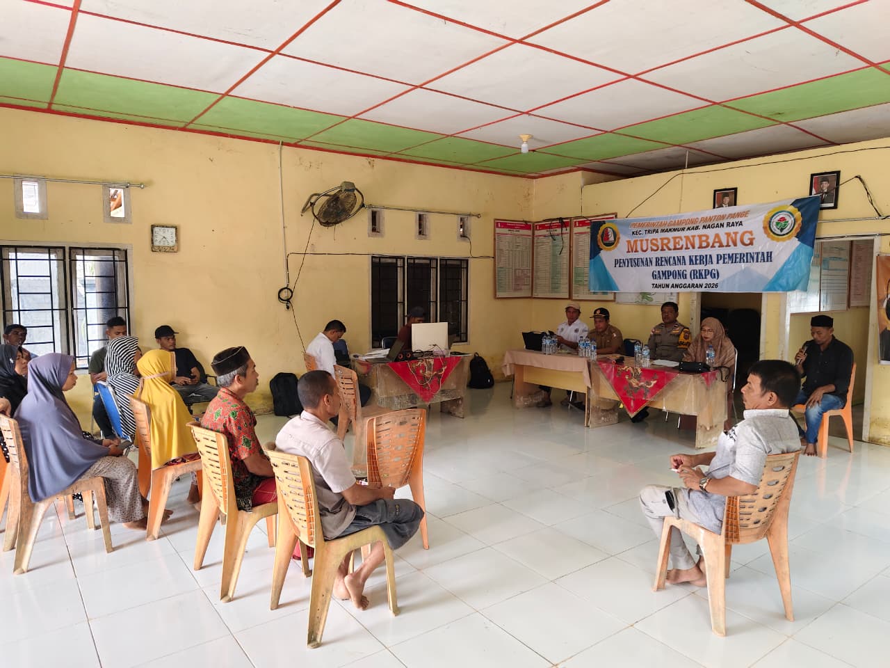Nagan Raya – Bhabinkamtibmas Polsek Darul Makmur melaksanakan monitoring kegiatan Musyawarah Perencanaan Pembangunan Gampong (Musrenbang) Tahun 2026 sekaligus Musyawarah Gampong pembahasan Rencana Kerja Pemerintah Gampong (RKPG) Tahun 2026 di Gampong Panton Pange, Kecamatan Tripa Makmur, Kabupaten Nagan Raya, Selasa (3/2/2026).