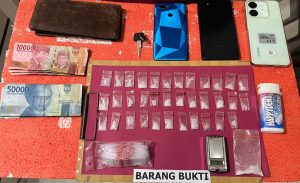 Dari hasil penggeledahan, petugas menemukan 36 paket sabu yang dibungkus plastik klip bening dengan berat bruto 9,35 gram. Selain itu, turut diamankan timbangan digital, plastik klip kosong, kotak permen, uang tunai Rp1.000.000, dompet, tiga unit telepon genggam, serta satu unit sepeda motor Yamaha RX King.