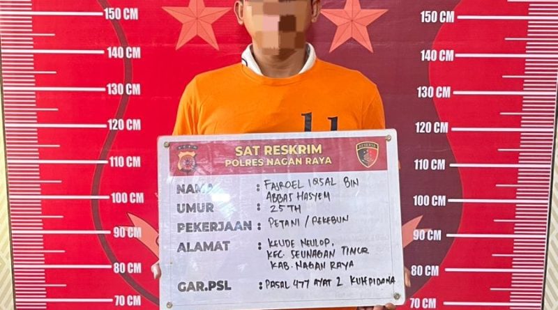Nagan Raya – Satuan Reserse Kriminal (Sat Reskrim) Polres Nagan Raya melalui Unit Pidana Umum (Pidum) melakukan penahanan terhadap satu orang terduga pelaku tindak pidana pencurian yang terjadi di area perkebunan PT. Fajar Baizuri, Desa Alue Bata, Kecamatan Tadu Raya, Kabupaten Nagan Raya, Sabtu (28/2/2026) sekitar pukul 16.00 WIB.