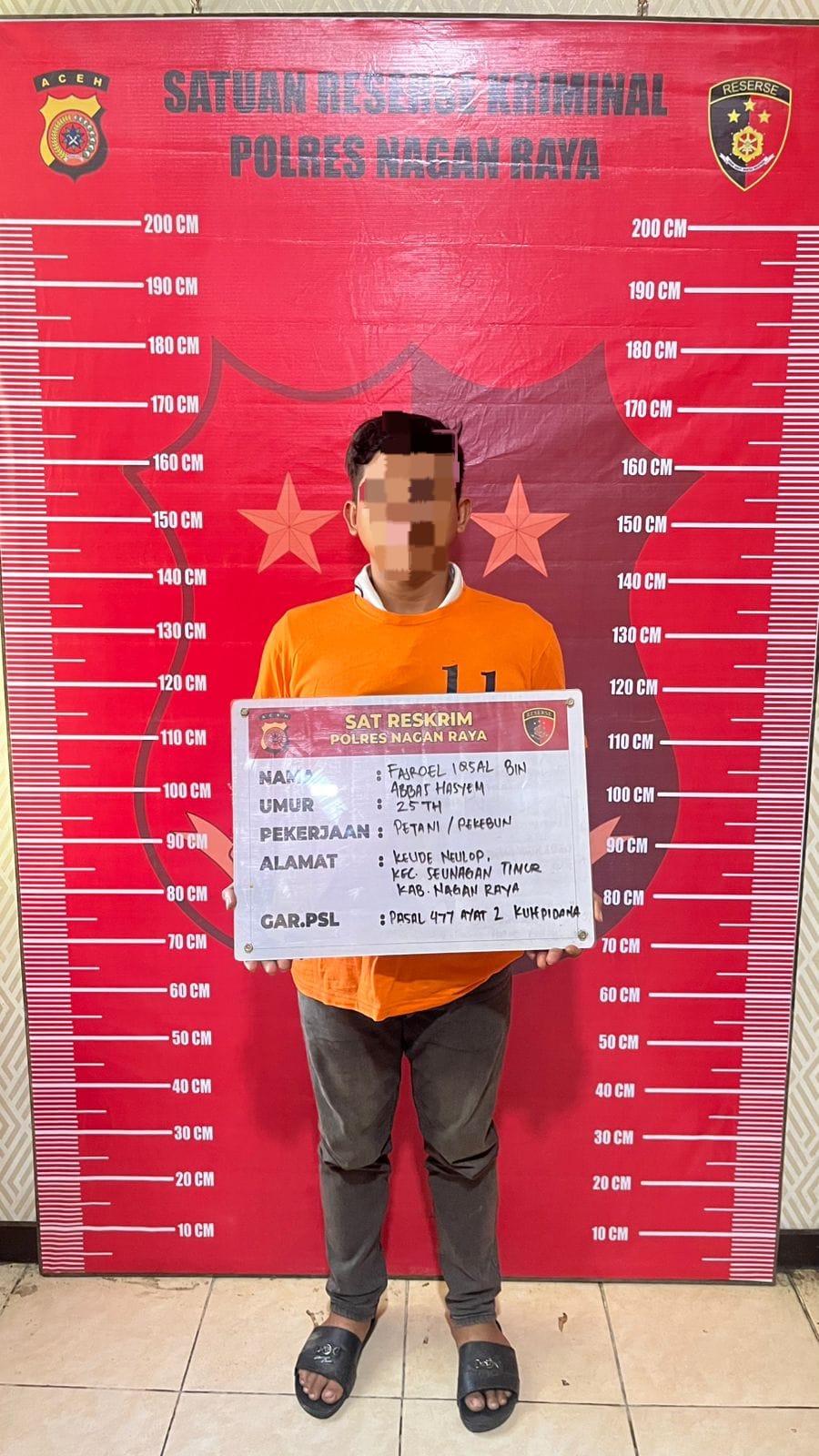 Penahanan tersebut dilakukan berdasarkan Laporan Polisi Nomor: LP/B/18/II/2026/SPKT/POLRES NAGAN RAYA/POLDA ACEH tanggal 7 Februari 2026, disertai Surat Perintah Penyidikan, Penangkapan, dan Penahanan yang telah diterbitkan secara resmi oleh penyidik.