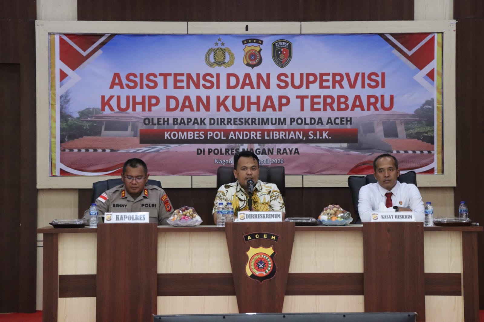 Nagan Raya — Dalam rangka meningkatkan profesionalisme dan kualitas penegakan hukum, Direktorat Reserse Kriminal Umum (Ditreskrimum) Polda Aceh melaksanakan kegiatan asistensi dan supervisi terkait penerapan KUHP dan KUHAP terbaru di Polres Nagan Raya, Jum’at 24 April 2026.